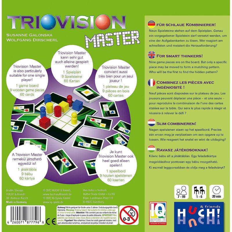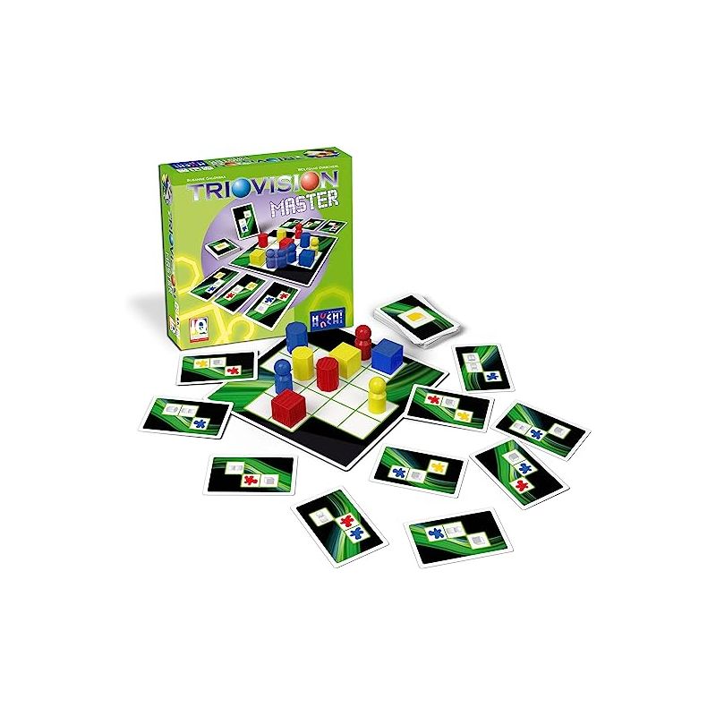 Huch - Triovision Master ( HT-877796 ) - Nouvelle version de Triovision avec des couleurs et des formes!? On pose au milieu de la table le plateau de jeu et les 8 pions. On découvre 12 cartes que l'on positionne autour du plateau. Tous les joueurs jouent en même temps. Il faut être le premier à repérer comment on peut reproduire la figure d'une carte en bougeant un seul pion sur le plateau. Chaque bon déplacement fait gagner la carte qui a servi de modèle. Les cartes donnent des indications de couleurs et de formes, ce qui rend la version Master plus difficile!Contenu : 1 plateau en carton rigide (19 x 19 cm), 8 gros pions en bois (3 couleurs et 3 formes), 60 cartes, règle